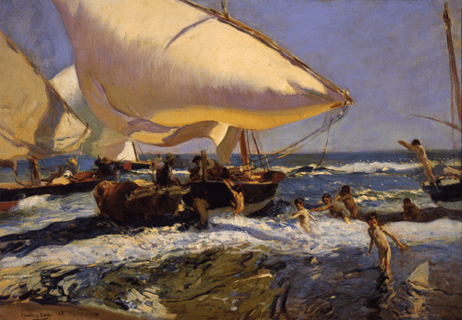 Among the pieces included in this exhibition is Sorolla’s 1908 oil on canvas Beach of Valencia (Playa de Valencia), depicting groups of people pushing a sailboat out to sea and frolicking in the water (Fig. 1). The piece is at once light and playful, and Sorolla has expertly rendered the sunlight bouncing off the sails of the boat and the water crashing on the shore, conveying a sense of movement and excitement. However, the artist’s color palette is rather subdued, leaning on the darker side than one might imagine when picturing a peaceful day at the beach, which lends an ominous feel to the painting. The piece is stylistically reminiscent of Sorolla’s contemporaries Pierre-August Renoir and Mary Cassatt, but also draws comparison to the works of earlier artists such as Diego Velázquez and Francisco Goya in its darker palette; these influences blend to create a style unique to Sorolla.