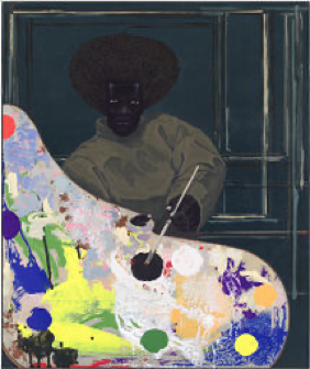 Rounding out this tour of OTH is the library, where the white patriarchs of the household likely read and discussed new knowledge and ideas of the time (Fig. 9). The room is adorned with painted portraits of white men and women, memorializing their contributions to America’s colonial history and innovation in the nineteenth century (“Library”). Yet missing from this room is the contributions of Black men and women to America’s growth and creativity; without Black labor, ingenuity, and perseverance, the new country would not have thrived. Replacing an existing portrait of a white man with Kerry James Marshall’s untitled 2008 work reminds the visitor that Black brilliance was present, regardless of their status as slaves, and it continues to flourish today (Fig. 10). Marshall’s work features a Black artist, again with a traditional afro honoring his heritage (echoing Simone Leigh’s Jug), staring pointedly at the viewer while holding a paint palette extended toward them, as if to engage them in a question or a challenge. The expression on the artist’s face serves as an apt ending to the tour, as it can be interpreted as saying, “yes, we were here too, despite this house’s outward evidence to the contrary,” and, “now that you know we were actively here, how does that reshape your perception of colonial and slave histories and knowledge-making?”